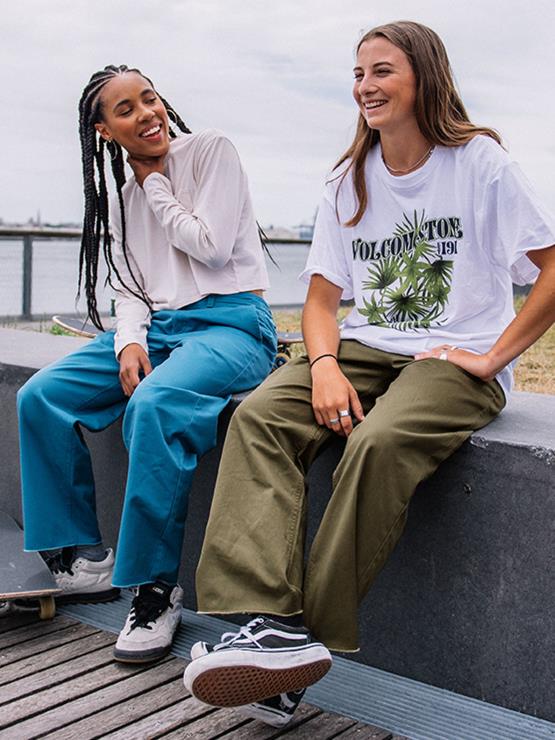 Conçu pour les femmes, inspiré du monde entier et testé sur la route, ce pantalon de skate est vraiment le meilleur. Fabriqué en collaboration avec les patineuses volcom, ce pantalon offre une taille haute modérée, des poches profondes et un élastique à l'arrière de la taille pour un ajustement confortable et flexible. liv lovelace sur le pantalon thisthatthem : ''le patinage féminin a tellement évolué depuis que j'ai commencé à patiner. tellement plus de filles l'essayent et c'est très inclusif. j'adore rouler pour skater et voir de plus en plus de filles.''